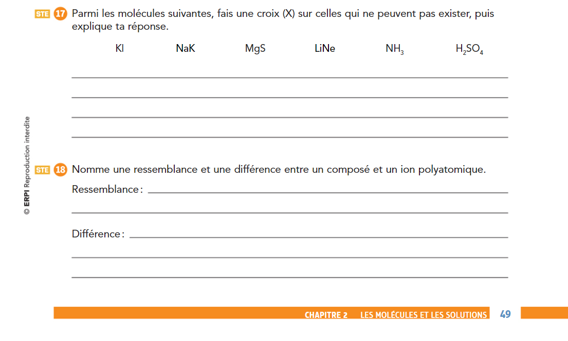 Est-ce que quelqu'un peut svp me donner une explication claire et détaillée pour ces 2 numéros?Pour le #18, je crois que la ressemblance c'est que les 2 sont formés suite à des liaisons chimiques. Puis pour de ce qui est de la différence, je ne suis pas sûre, mais je crois que les ions polyatomiques sont formés par la liaisons chimiques uniquement d'atomes alors que celle des composés ça peut soit être molécules ou atomes. (Pour le 17, j'en ai aucune idée, mais je supposes que c'est à l'aide de la notation de Lewis...)