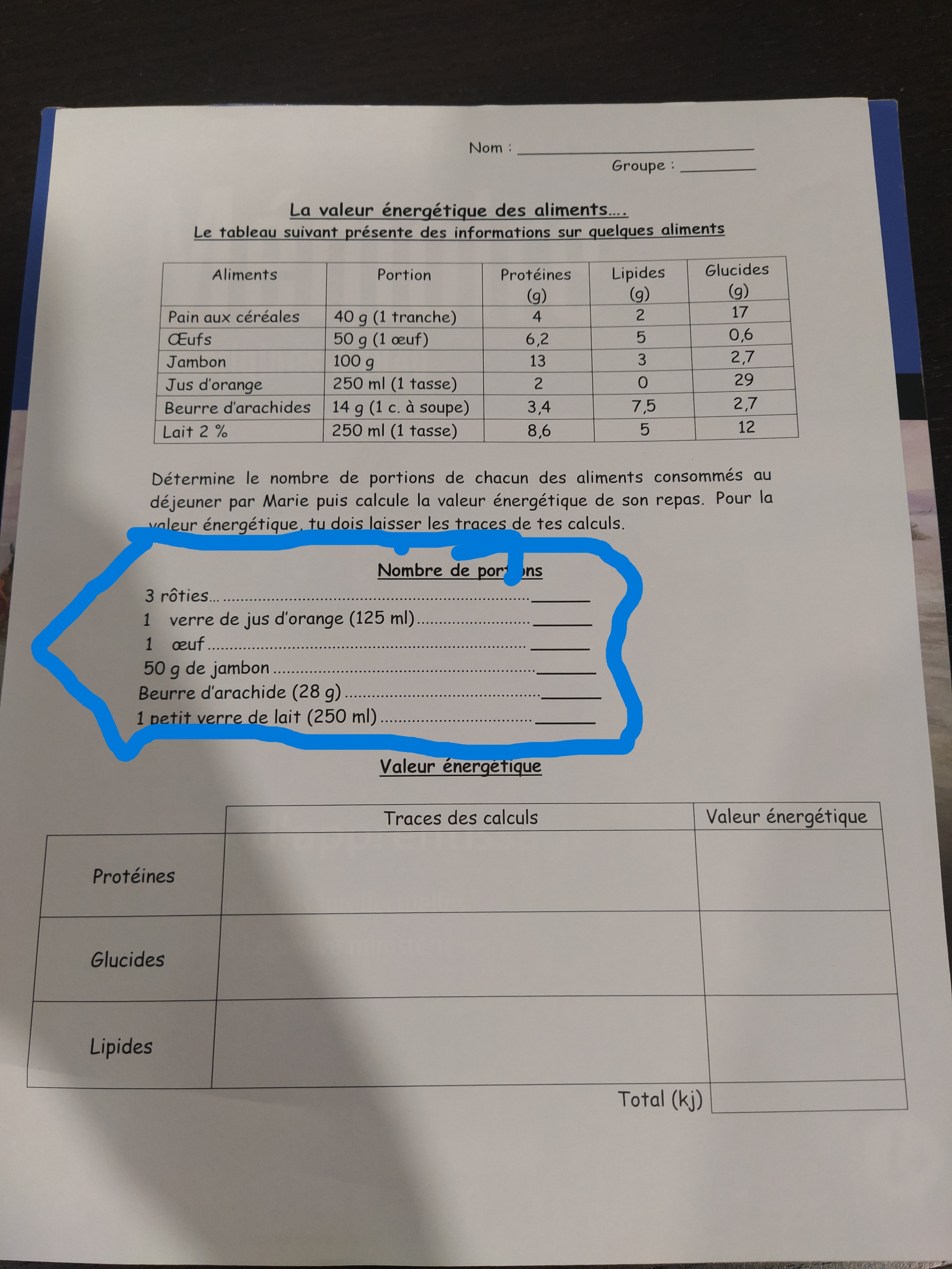 Secondaire 3 • 25jBonsoir comment on détermine la portion nde chacun des aliments ? Je n'ai pas compris , aidez moi svp au plus vite !Merci