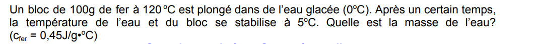 Avec cet exercice, est-ce que je devrais avoir une variation de température négative ainsi que de la chaleur négative, puis je me sers de la valeur absolue de chaleur que j'ai obtenu pour trouver la masse de l'eau ?