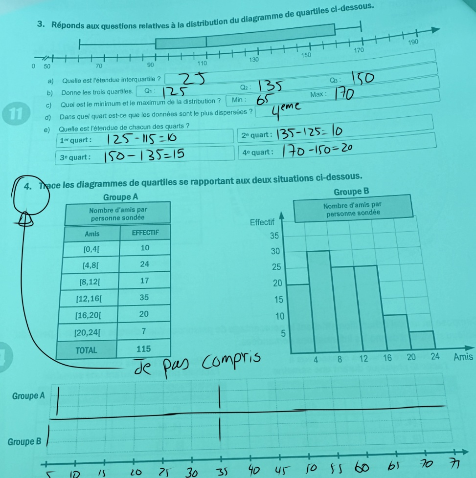 Pour le numéro 4, nous avons justement une fiche qui explique comment tracer un diagramme de quartile (et comment l'interpréter)! Je te laisse aller la consulter: