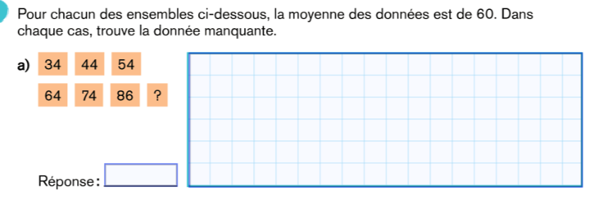 Prenons un exemple pour mieux comprendre. On a sept nombres, mais on ne connait la valeur que de six de ces nombres, soit 10, 6, 8, 12, 7, et 9, et on sait que la moyenne de ces sept nombres est de 8. On cherche le 7e nombre manquant.