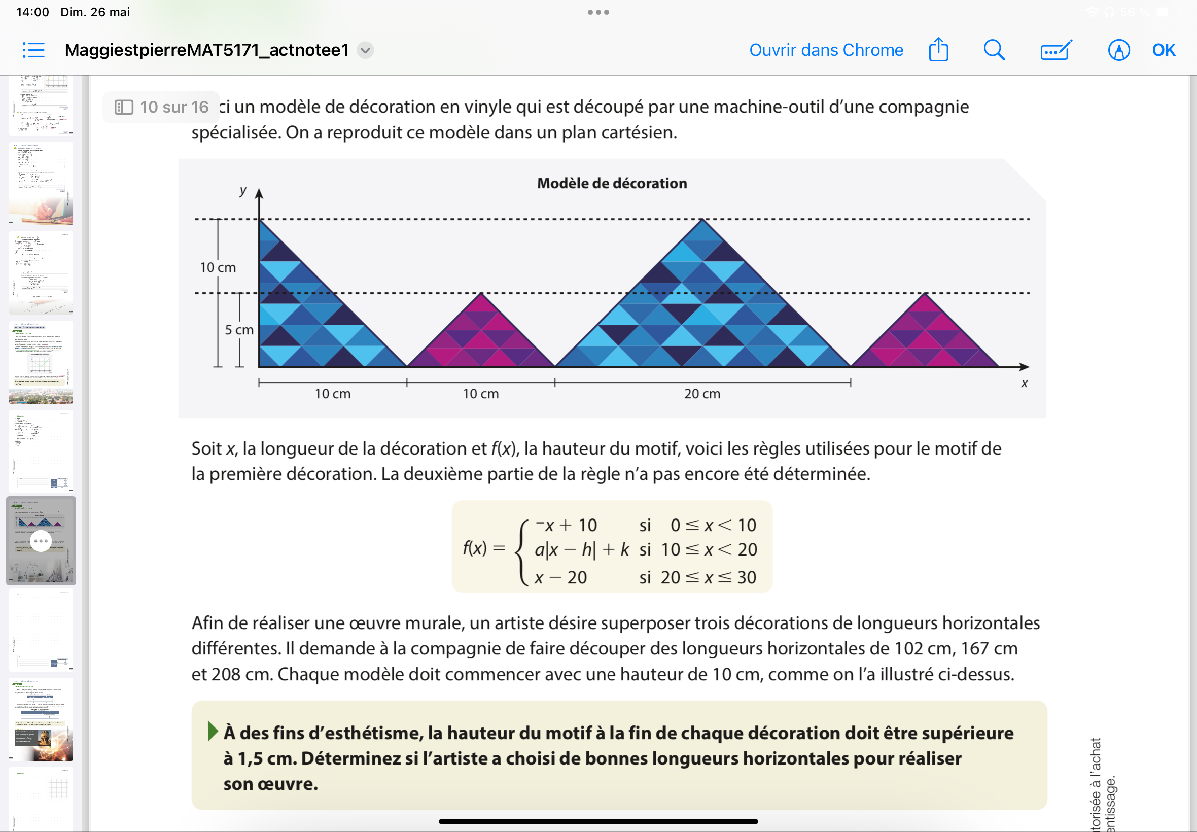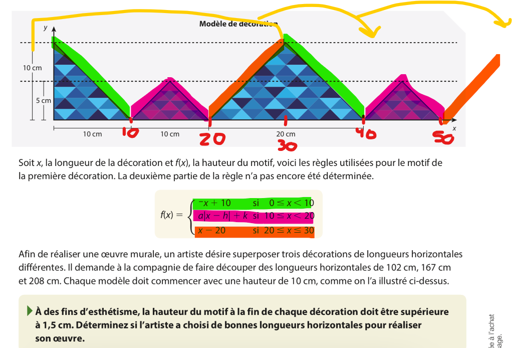 Si une décoration a une longueur horizontale de 102 cm, cela signifie que le motif se rend jusqu'à x=102 cm. Tu dois donc déterminer le motif qui est à x=102 cm en utilisant le concept de cycle et de période pour pouvoir ainsi vérifier si à x=102 cm, y>1,5 cm, c'est-à-dire que la hauteur du motif à la fin de la décoration est supérieure à 1,5 cm.