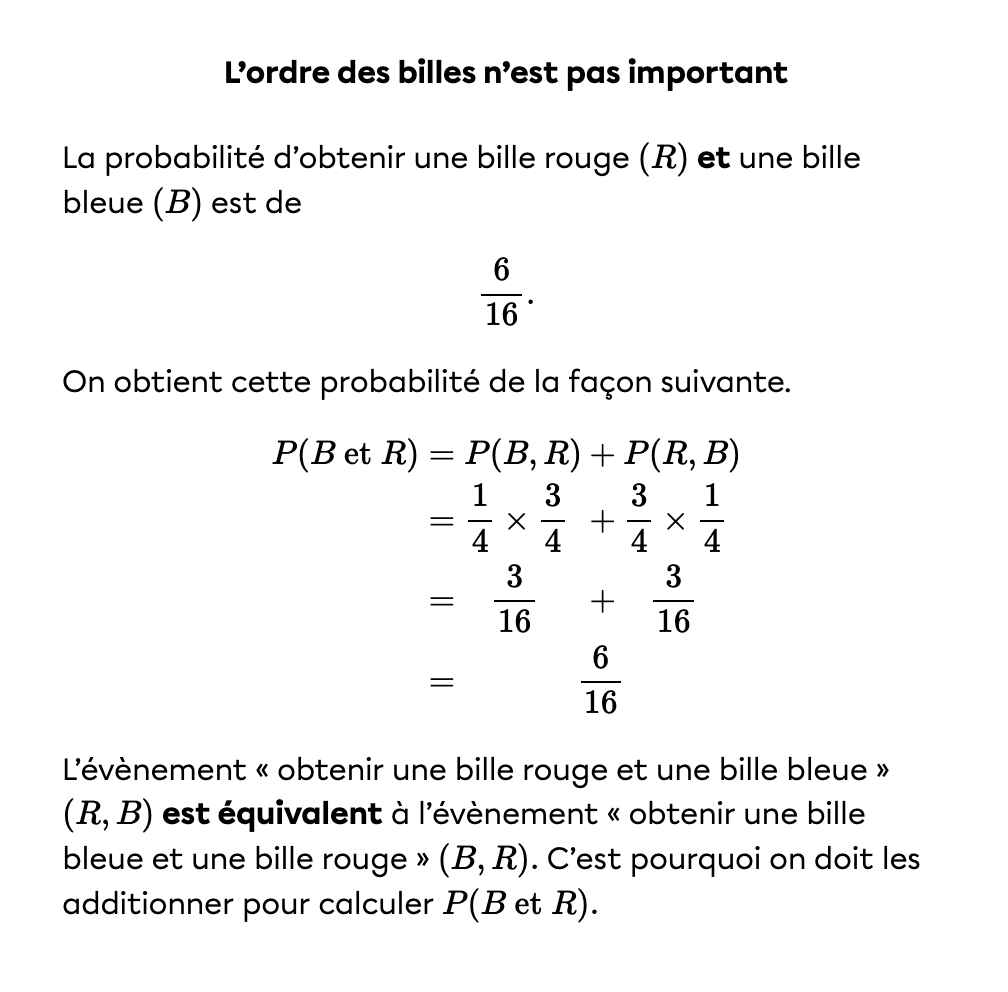 La probabilité d'obtenir une bille rouge ET une bille bleue [P(B et R)] correspond à la probabilité d'obtenir une bille bleue suivie d'une bille rouge [P(B, R)] OU une bille rouge suivie d'une bille bleu [P(R, B)]. Cela correspond effectivement à la même chose. Puisqu'on souhaite obtenir l'un ou l'autre, on additionne les deux probabilités.