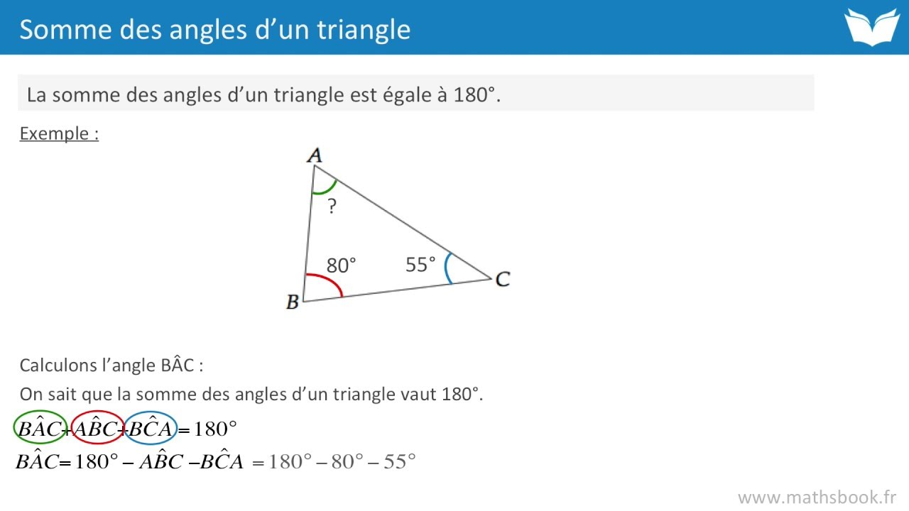 De plus, il est également important de se rappeler que la somme des angles intérieurs d'un triangle est de 180 degrés. Ceci te servira à trouver l'angle manquant dans un triangle si tu connais les deux autres angles, comme dans l'exemple suivant :