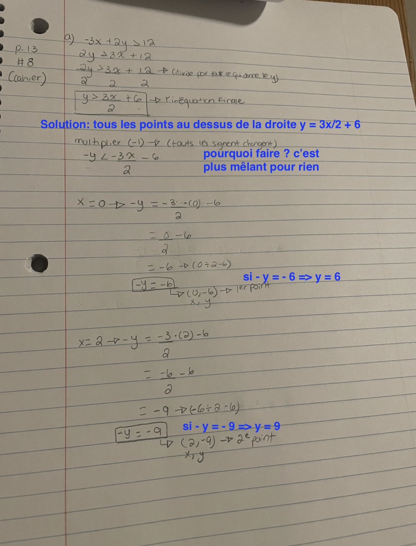 Je fais des inéquations. Selon le corrigé dans mon cahier. Le premier point de trouvé est (0,6). Moi j’ai trouvé (0,-6). Pour trouver mon y, j’ai remplacer X=0.