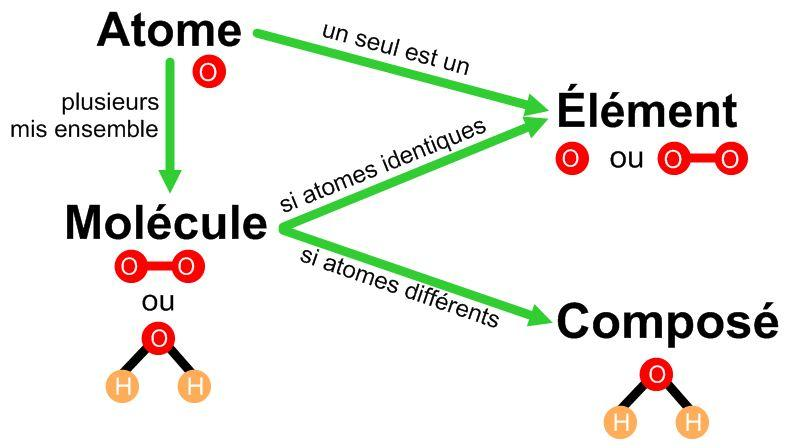 Tous les composés sont des molécules, mais pas toutes les molécules sont des composés. Pour être considéré une molécule, il faut y avoir un arrangement d'au moins deux atomes, qu'ils soient identiques ou différents. En revanche, pour être un composé, il faut un arrangement d'au moins deux atomes différents. Voici une image qui résume le concept :