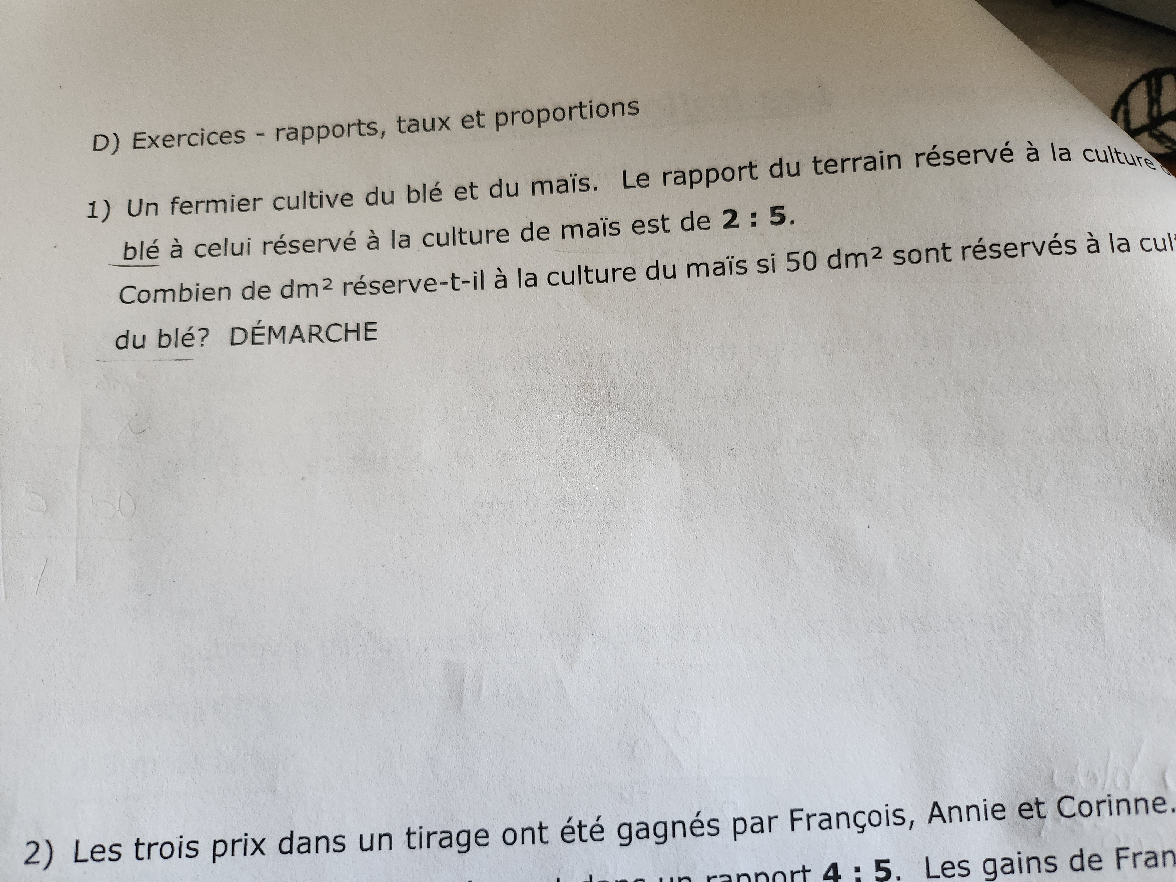 Comme on sait que le rapport est 2:5, il faudrait faire une relation de proportionnalité. Quand les rapports sont inscrits de cette façon, on peut en comprendre que 2dm^2 sont réservés au blés pour 5dm^2 qui est réservé au blé. Il y a donc en tout 7dm^2. Tu peux donc interpréter que: