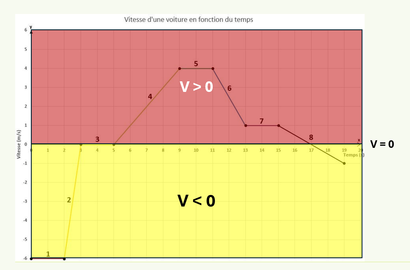 Le graphique représente la variation de la vitesse d'un objet en fonction du temps. Si la pente est positive, la vitesse augmente et si la pente est négative, la vitesse diminue. Toutefois, il faut aussi faire attention au référentiel. Ainsi, si la vitesse est positive, l'objet bouge dans un sens et si la vitesse est négative, alors l'objet va dans le sens inverse. Finalement, si la vitesse est nulle, l'objet ne bouge pas.
