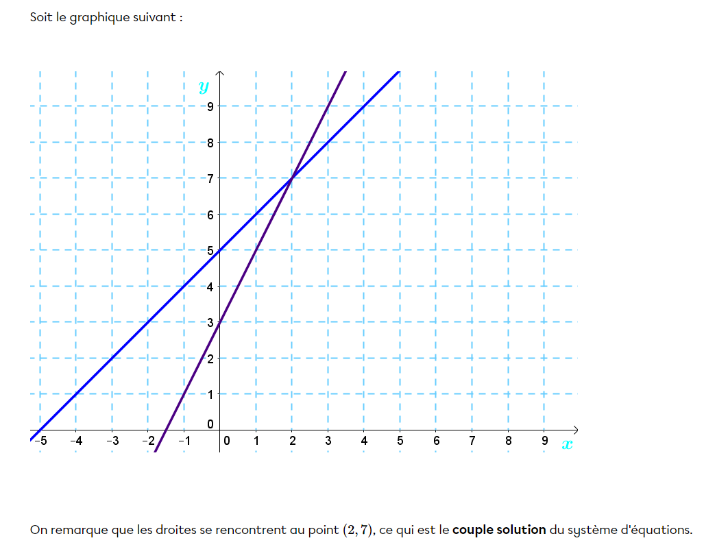 Si tu souhaites plutôt trouver le point d'intersection des deux droites algébriquement (c'est-à-dire à l'aide de calculs), on doit alors résoudre le système d'équations. Prenons un exemple pour mieux comprendre :