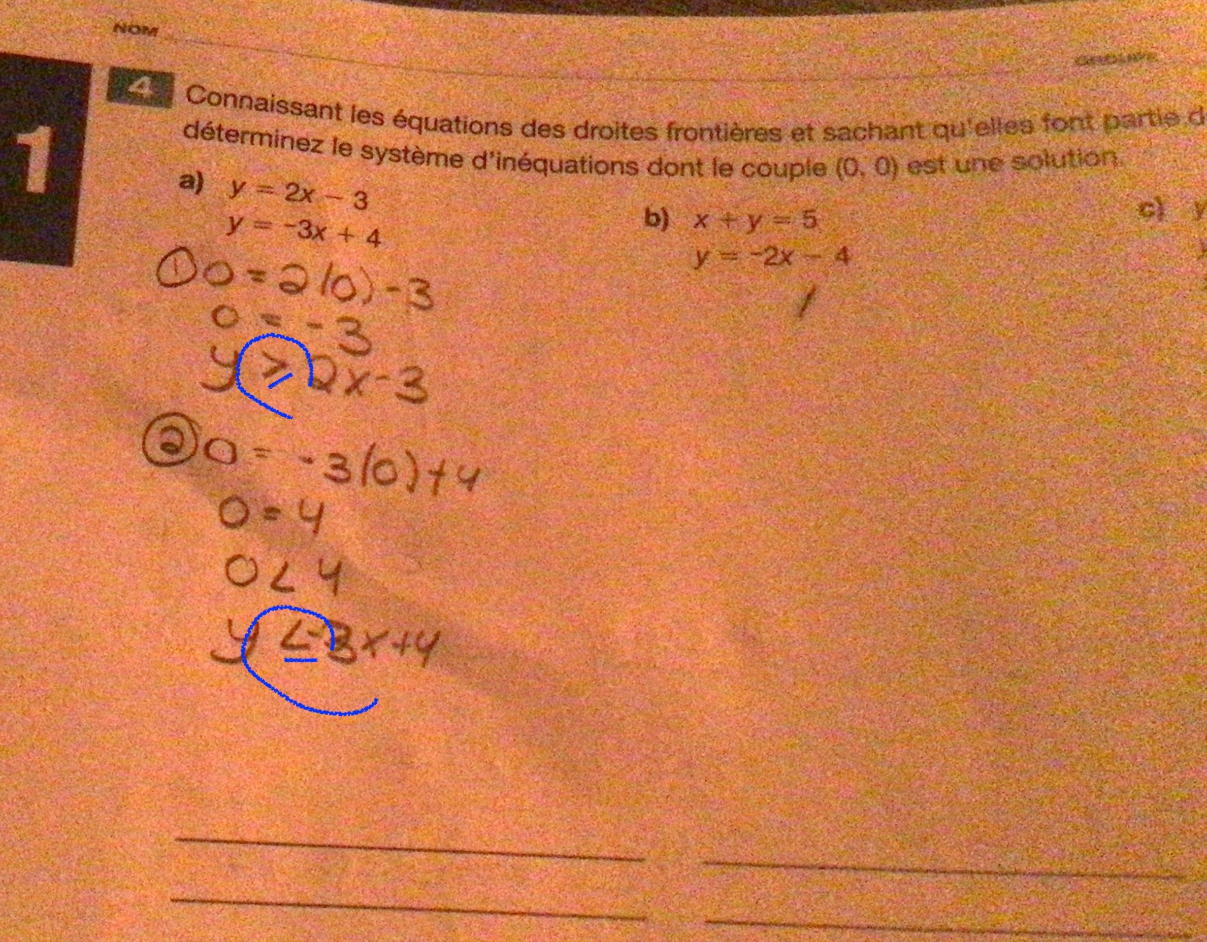 Bonjour, je me demandais comment dans ces situations, je fais pour savoir si je dois mettre la barre en dessous du signe d’inéquation? Je sais comment faire dans un graphique, mais la je sais pas pourquoi on dirait que je bug. Sur la photo (qui est vraiment sombre en passant désolée) mes signes sont du bon sens mais dans le corrigé il y a une ligne en dessous du signe et j’aimerais savoir pourquoi. Merciii