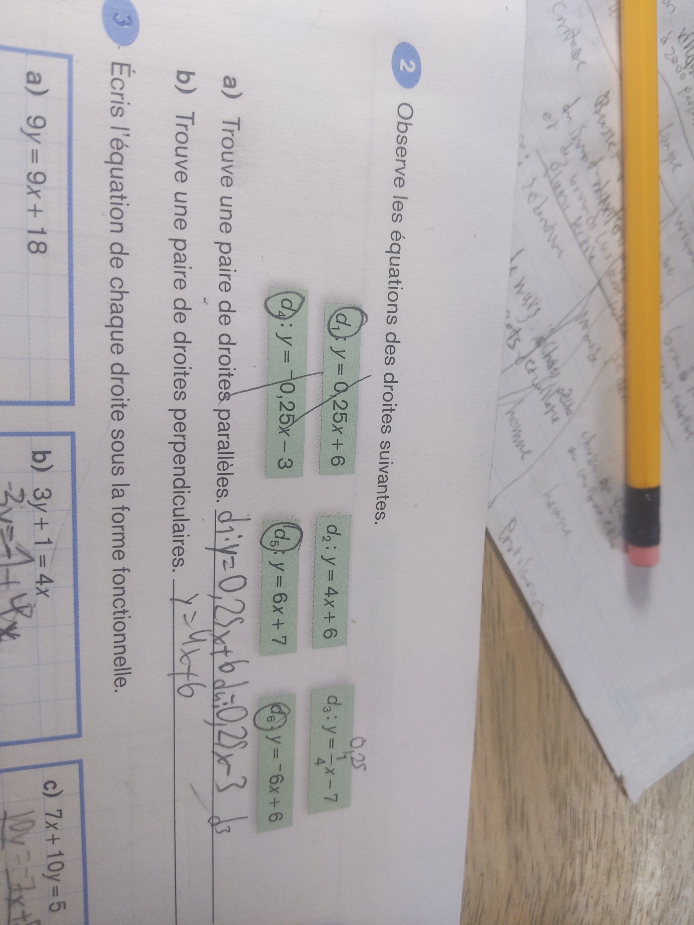 De plus, en b), tu n'as pas identifié une paire de droites perpendiculaires. Tu dois nommer deux droites, comme tu as fait en a). Quelle droite a une pente opposée et inverse de 4, la pente de la droite y=4x+6 ? Tu peux écrire ta réponse finale avec le numéro de droites comme tu l'as fait en a) (d2 et d...?).