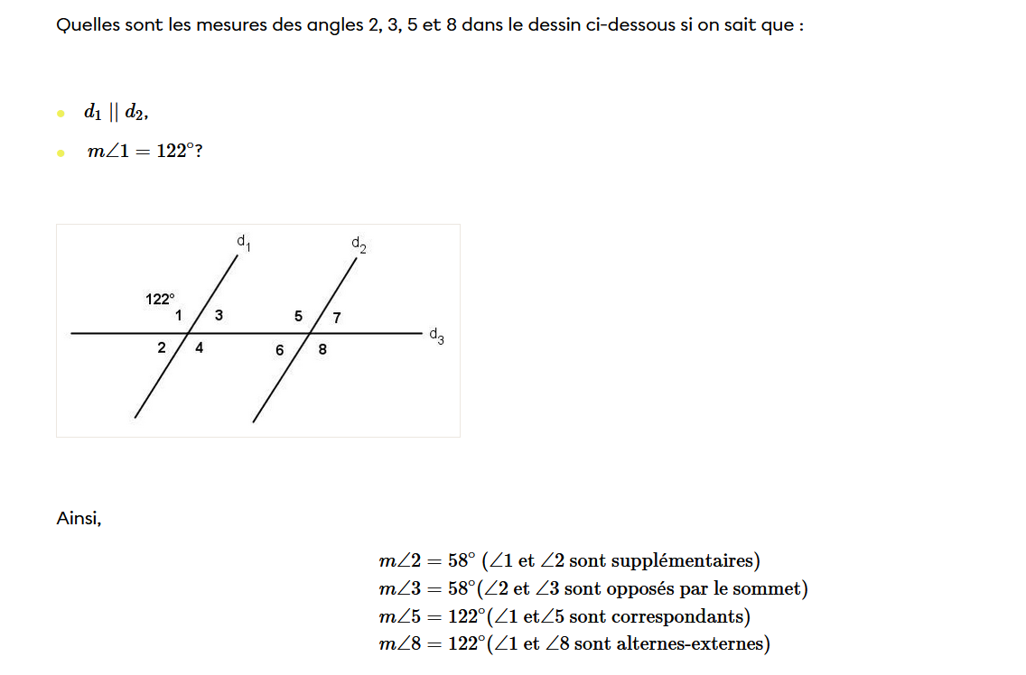 Tu verras, tu comprendras mieux après cette lecture. La position des angles les uns par rapport aux autres, t'aidera à trouver les mesures (certains seront égaux, d'autres complémentaires ou supplémentaires).
