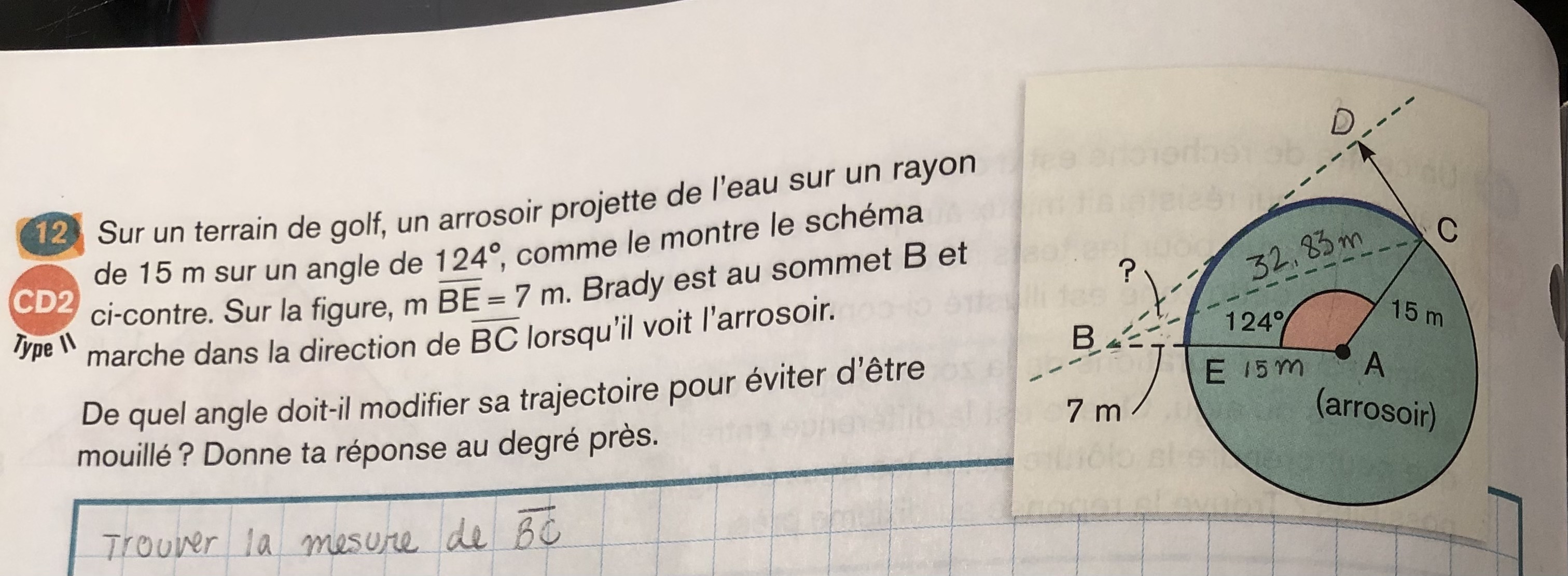 Il est possible de considérer ce triangle comme étant rectangle, car le rayon d'un cercle est perpendiculaire à la tangente. Deux droites perpendiculaires donnent un angle droit. L'hypoténuse est de 22m et la mesure du côté opposé à l'angle DBE est de 15m puisqu'il s'agit du rayon.