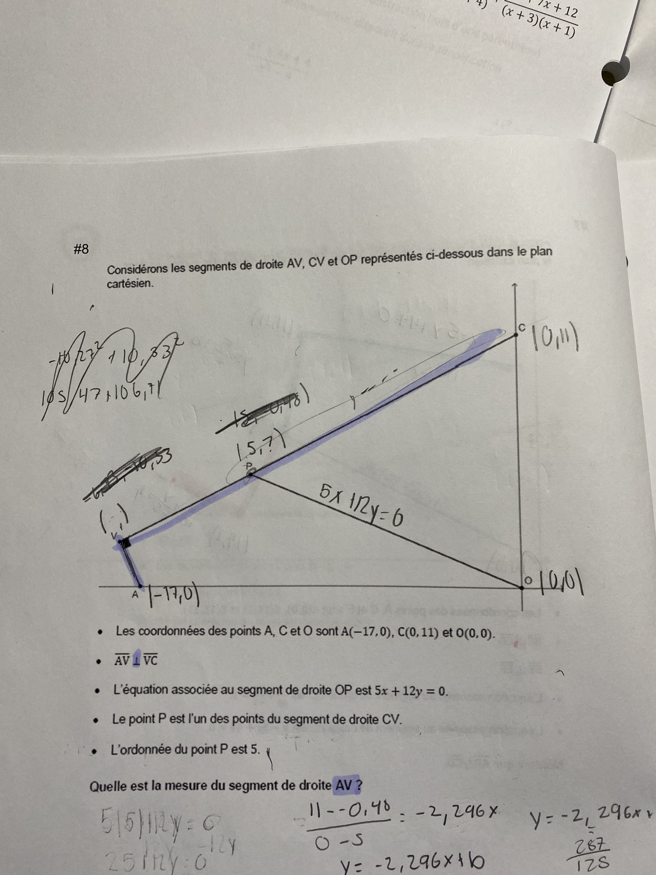 Ensuite, trouve l'équation de la droite PC, puis, à partir de là, tu pourras déterminer l'équation de la droite AV (en utilisant le fait que tes deux droites sont perpendiculaires et en t'aidant des coordonnées du point A).