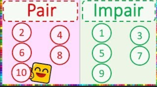 un nombre pair est un nombre qui commence toujour par: 2,4,6,8 ou 0. Si il termine par ses nombres, ce sont des nombres impair si ça se termine par ;1,3,5,7,9