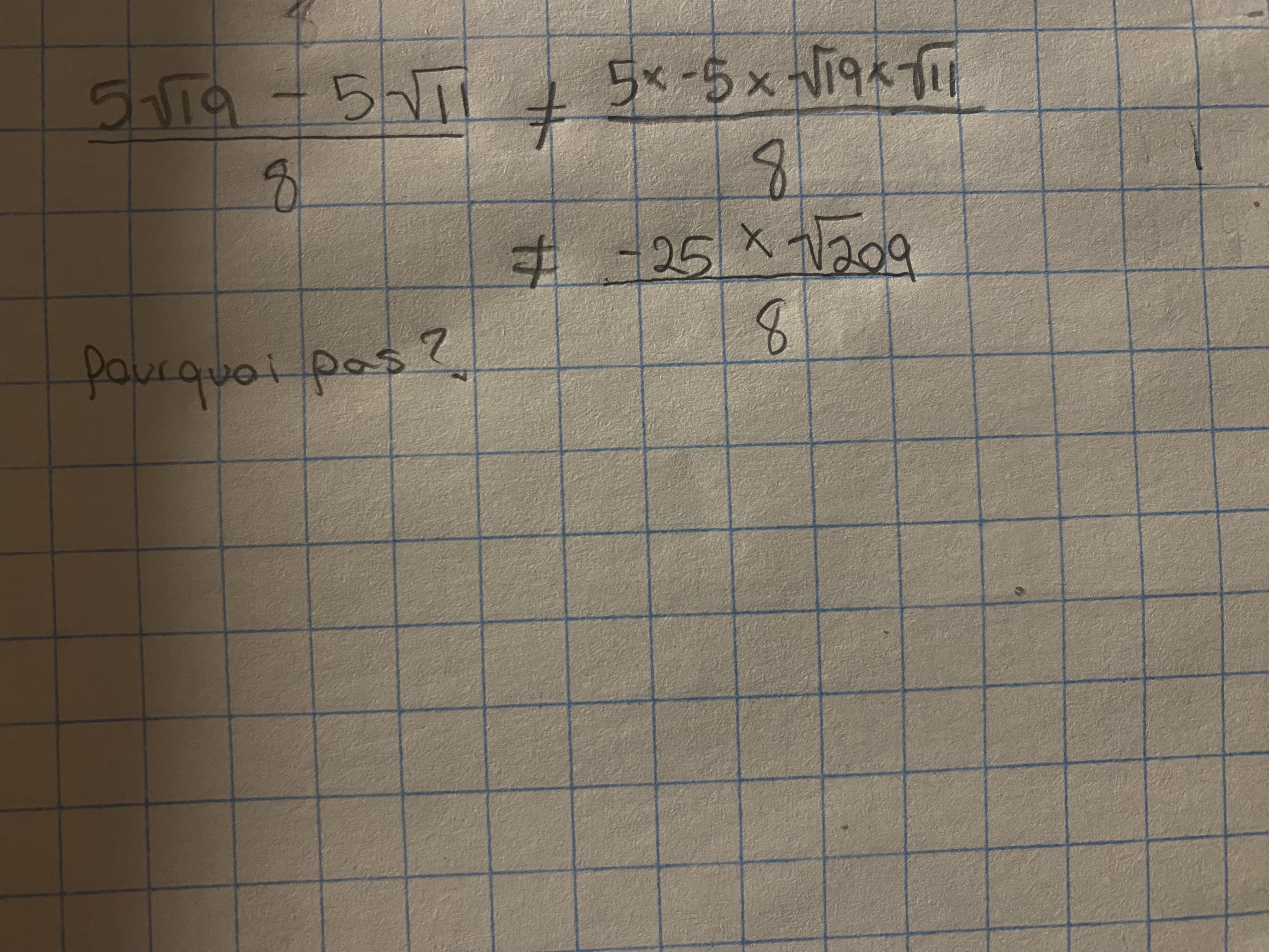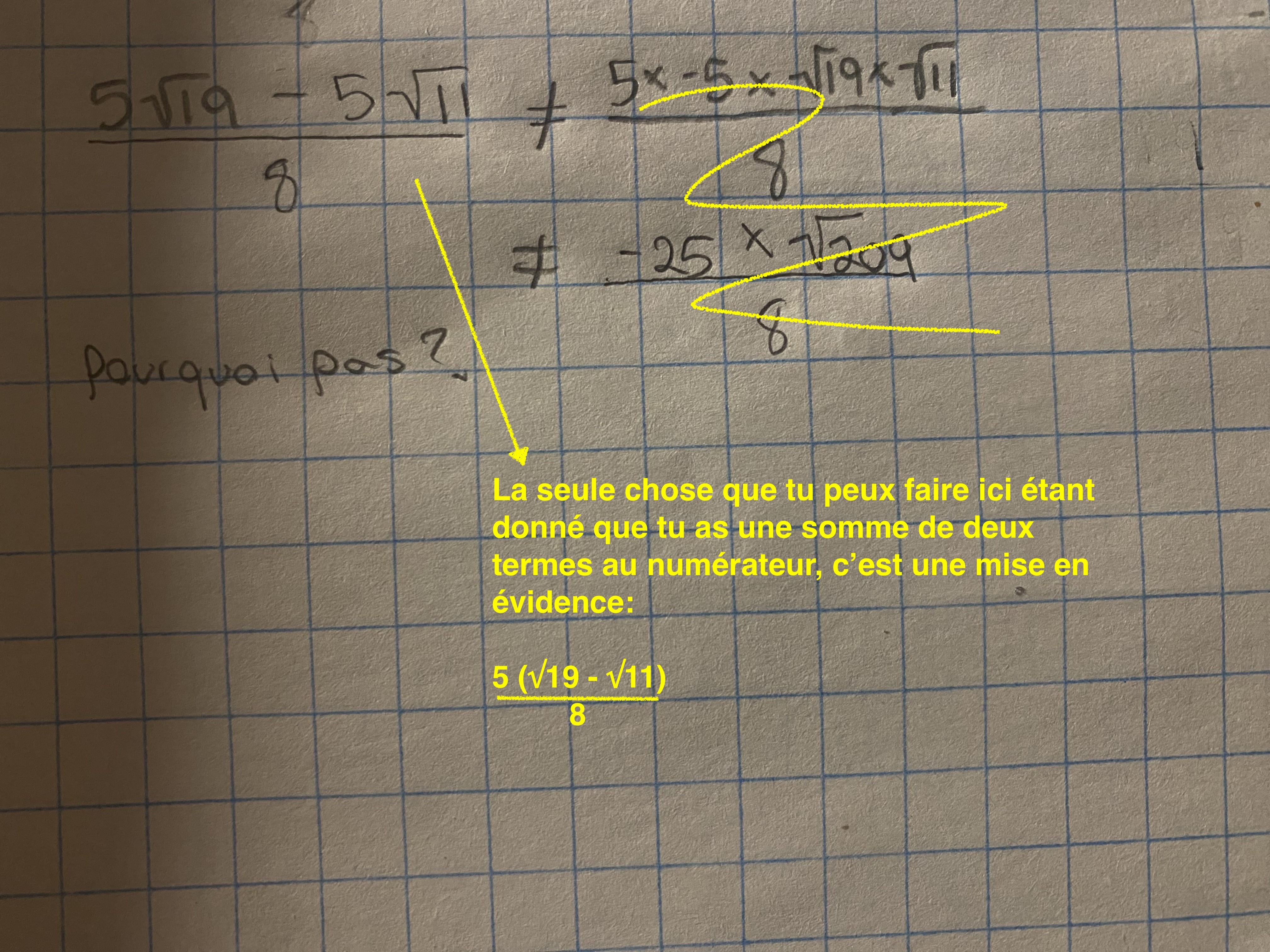 Bonjour, je fais des exercices à éliminer les radicaux au dénominateur des expressions et j’arrive pas à comprendre pourquoi je ne peut pas faire cela. Pouvez vous m’expliquer pourquoi? Merci!