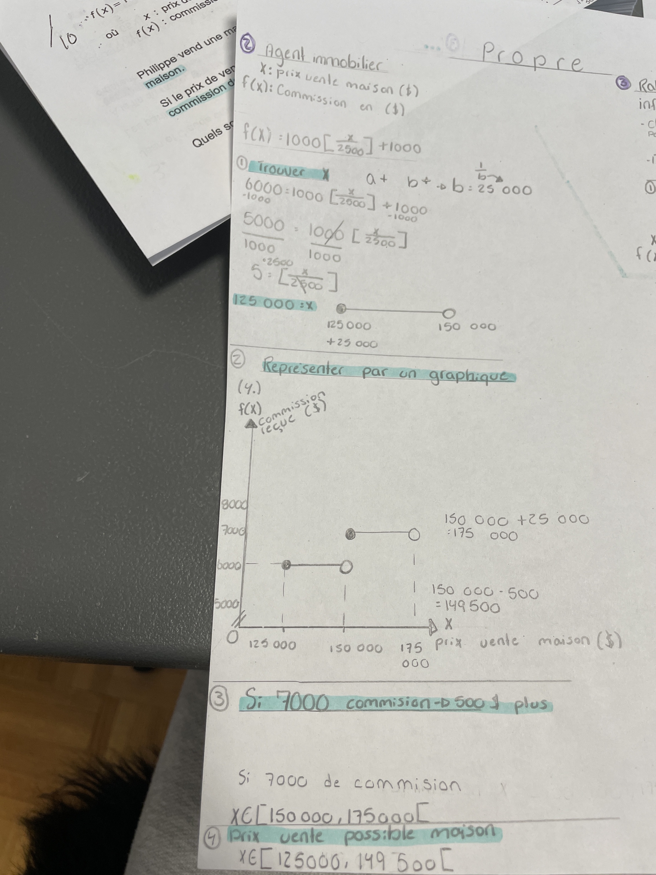 Maintenant on nous dit que si x était de 500$ de plus la commission de l'agent serait de 7000$ donc dans ce cas, x doit être assez proche de 150000 en fait au minimum, il faut que x soit 150000-500 = 149500$