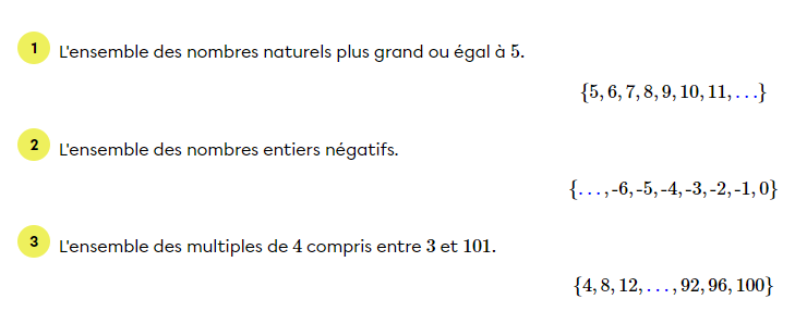 Il est parfois trop long ou impossible d'écrire tous les éléments d'un ensemble. Dans ces cas, on utilise les points de suspension (...)