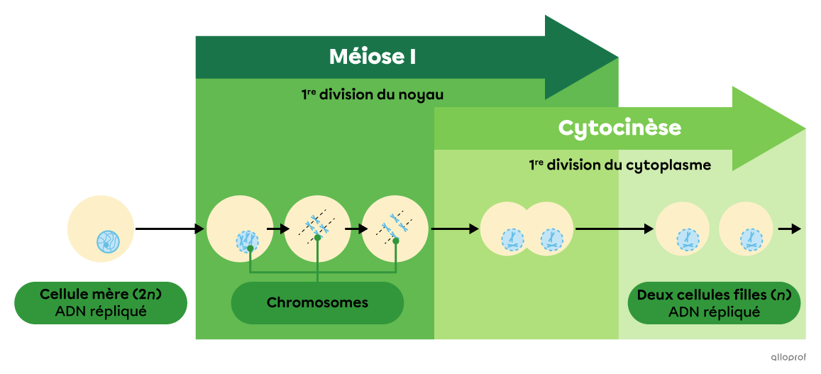 La méiose est une division cellulaire réductrice, c’est-à-dire que le bagage génétique des cellules filles est réduit par rapport à celui de la cellule mère. En effet, la cellule mère 2n (diploïde) produit quatre cellules filles n (haploïdes).