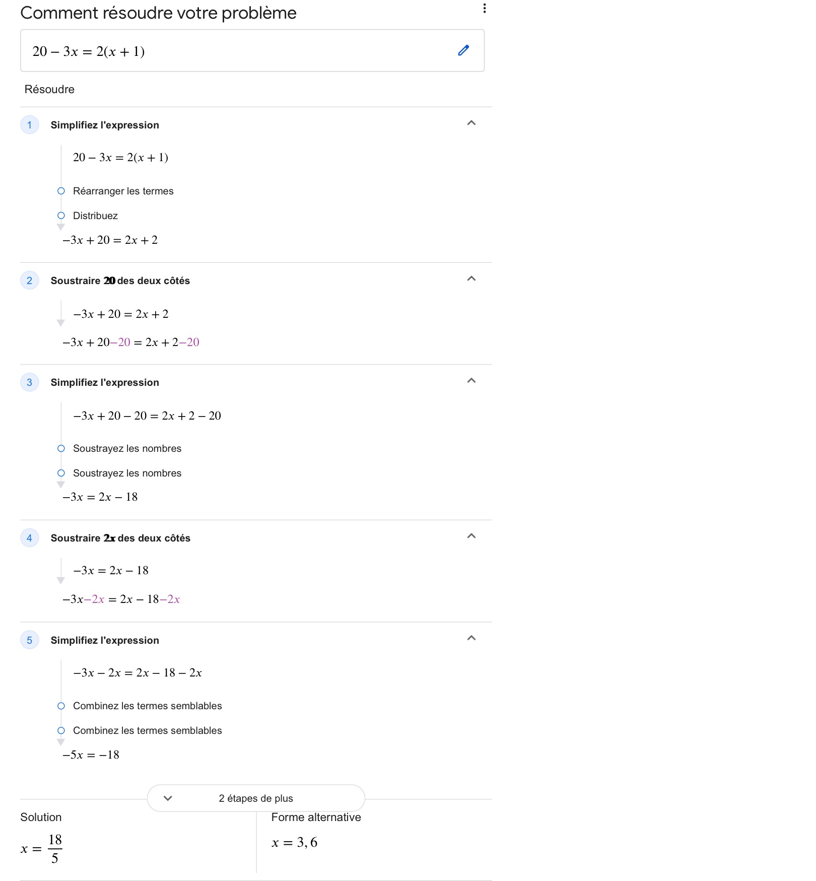 Tu peux faire 20 - 3x = 2x + 2 (distribution du 2 sur chaque terme)