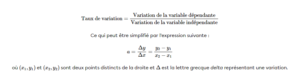 La pente, aussi appelé taux de variation, est donnée par le paramètre \(a\) dans la règle \(y=ax+b\).