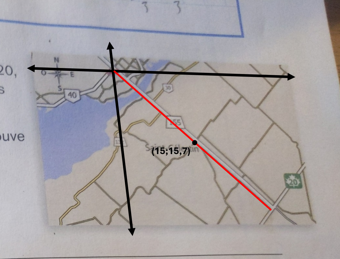 Le segment en rouge correspond à une distance de 40 km. Tu peux donc trouver avec les coordonnées de Saint-Célestin, la distance entre l'origine (l'automobile) et la ville.