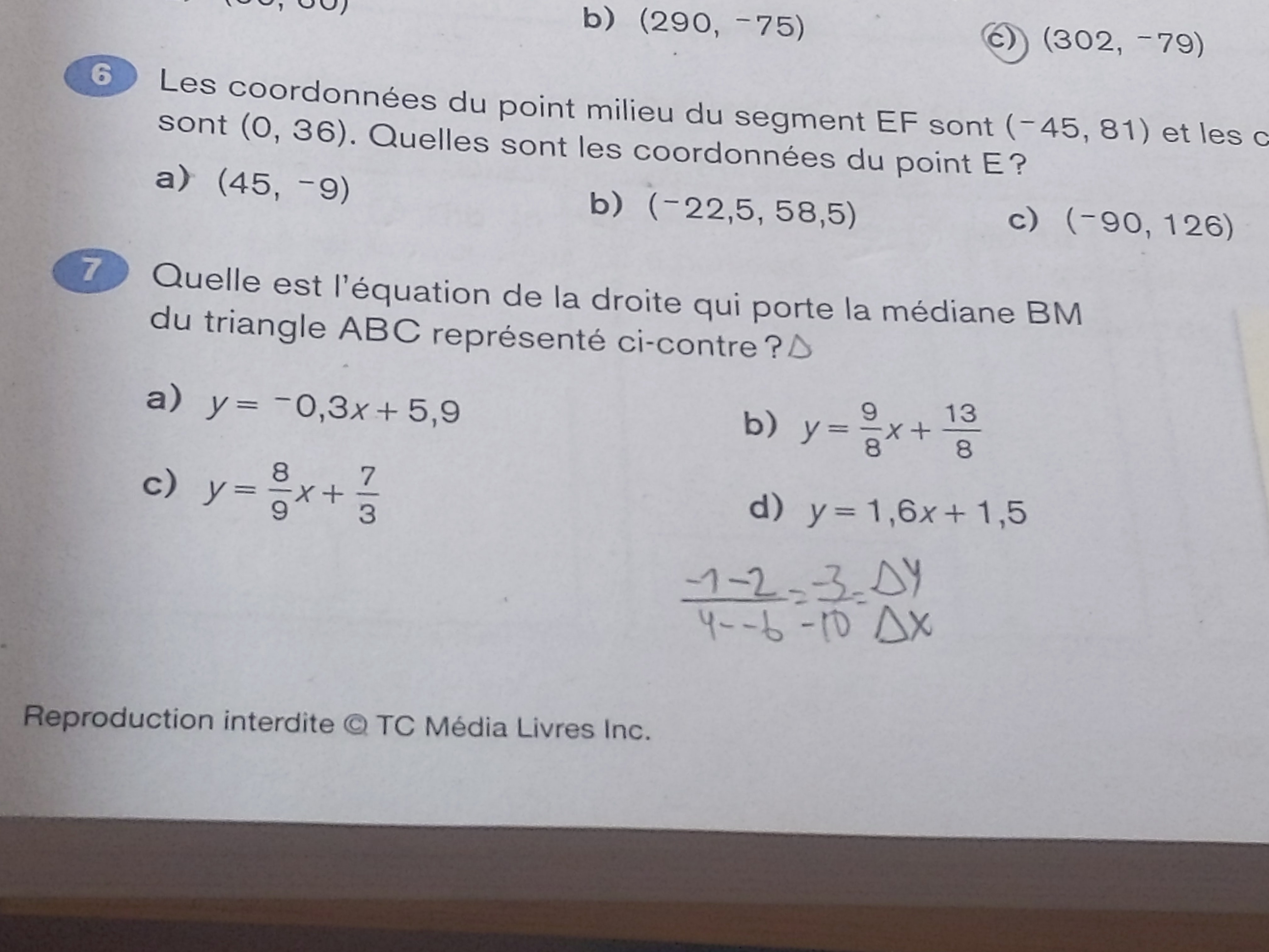 Puis, avec les coordonnées des points B et M, tu pourras trouver la règle de la droite médiane. Voici une fiche qui pourrait t'être utile : Trouver la règle d'une fonction affine | Secondaire | Alloprof