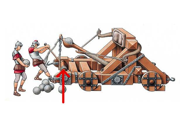 Le point d'appui est donc la pièce autour de laquelle pivote le levier. Elle se situe ici sur une catapulte, le levier étant tiré par le soldat.