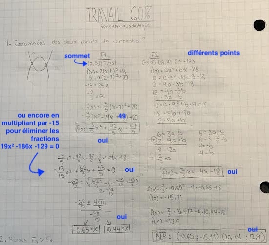 salut, voici le corrigé d’un problème de math que je n’arrive pas à comprendre. J’ai essayé de tout rendre égal à zéro les formule f1 et f2, et ensuite j’ai voulu utiliser la formule ( b+/- racine carré -b^2-4ac / 2a)pour trouver les zéros. Ça n’a pas fonctionner. Je me demande alors pourquoi. Aussi, dans le corrigé, je devrais transformer la formule en générale
