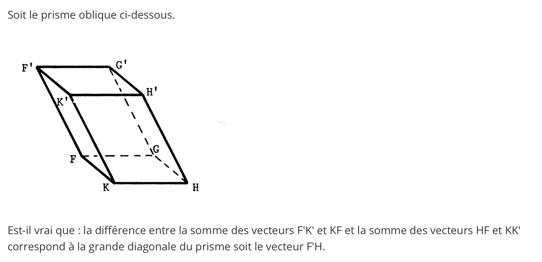 Tu devras utiliser les égalités de vecteurs KF=K'F' et KK'=FF' puis appliquer la loi de Chasles pour additionner les vecteurs.