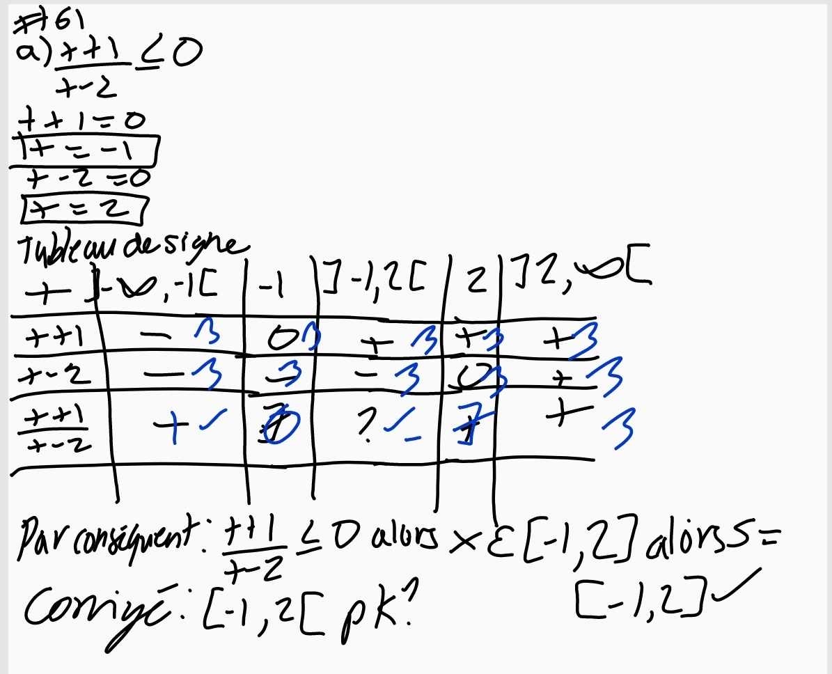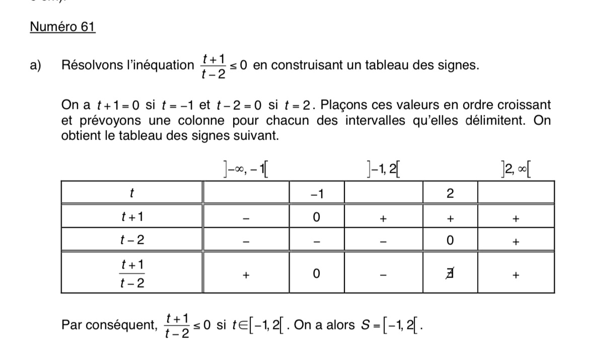Pour la dernière ligne de ton tableau, tu dois déterminer le signe de la fonction en multipliant les signes des deux lignes précédentes. Ainsi, pour ]infini-, -1[ par exemple, tu as deux signes négatifs. Lorsqu'on multiplie des nombres négatifs ensemble, le résultat est positif. C'est pourquoi la fonction t+1/t-2 est positive avant t=-1.