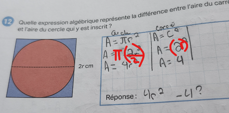 Tu dois donc remplacer \(c\) par (2r\) dans la formule d'aire d'un carré :