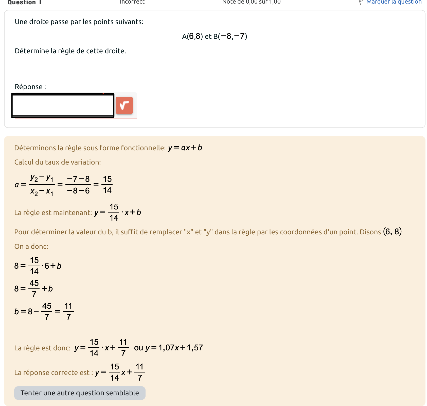 La première étape est de trouver la pente 15/14. Ensuite, il faut trouver l'ordonnée à l'origine b. Pour cela, il faut remplacer x et y dans la règle par les coordonnées d'un point connu, ici (6, 8) (On aurait également pu prendre (-8, -7), le résultat sera le même). Cela nous donne alors cette équation :