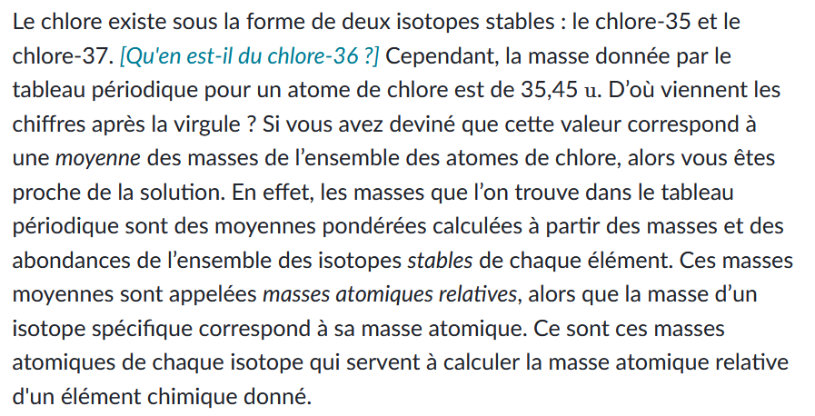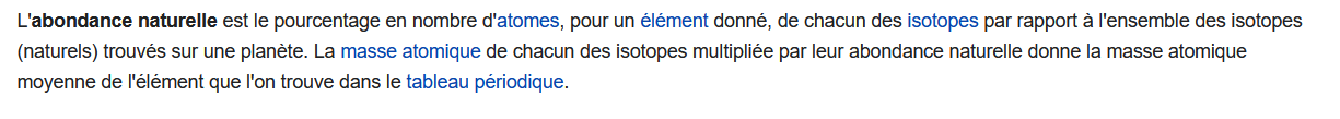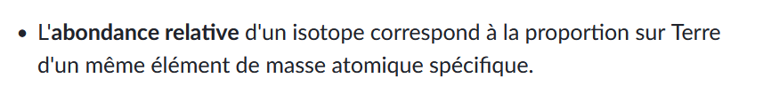Pour répondre à ta question, oui, l'abondance relative est calculée en fonction des différents isotopes présents dans la nature. En faisant une moyenne, on trouve donc la masse atomique du tableau périodique de l'élément en question.