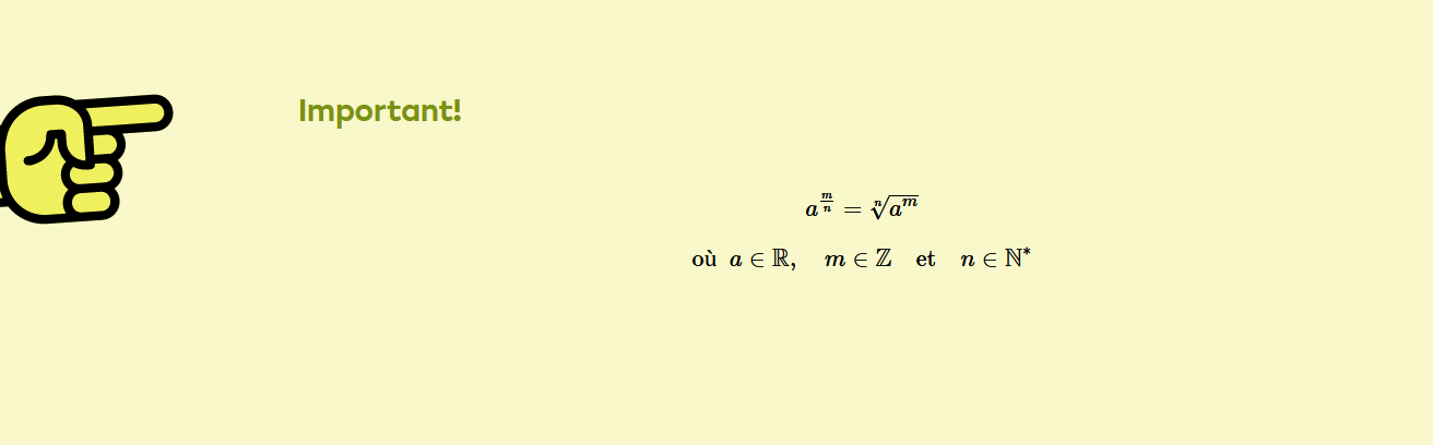 Voici mon truc pour l'exposant fractionnaire (exposant qui est une fraction). Je retiens que :