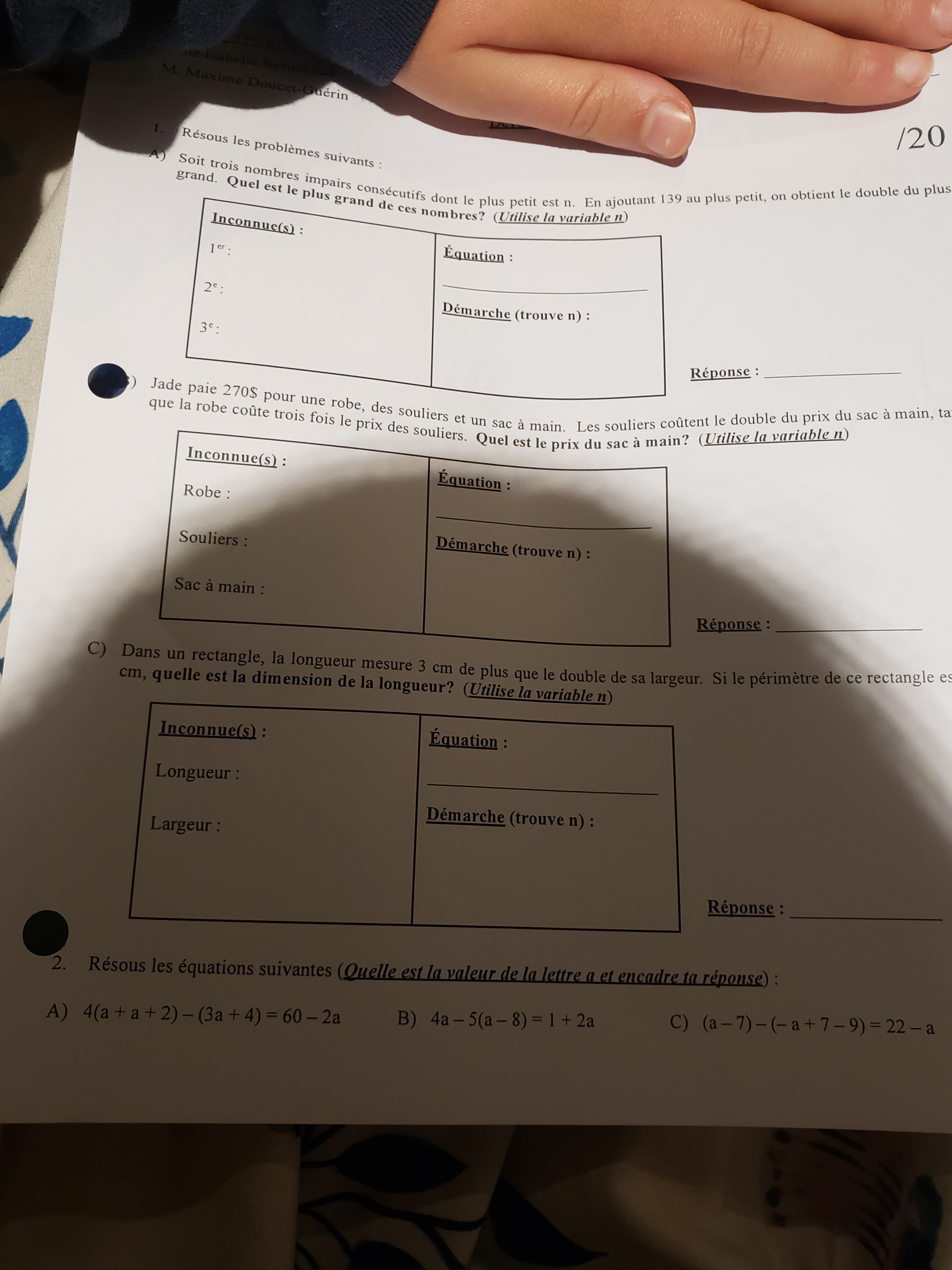 De plus, on nous dit qu'en ajoutant 139 au plus petit nombre, donc \(n\), on obtient le double du plus grand nombre, soit \(n+4\). Je te laisse trouver l'équation associée à cet énoncé.