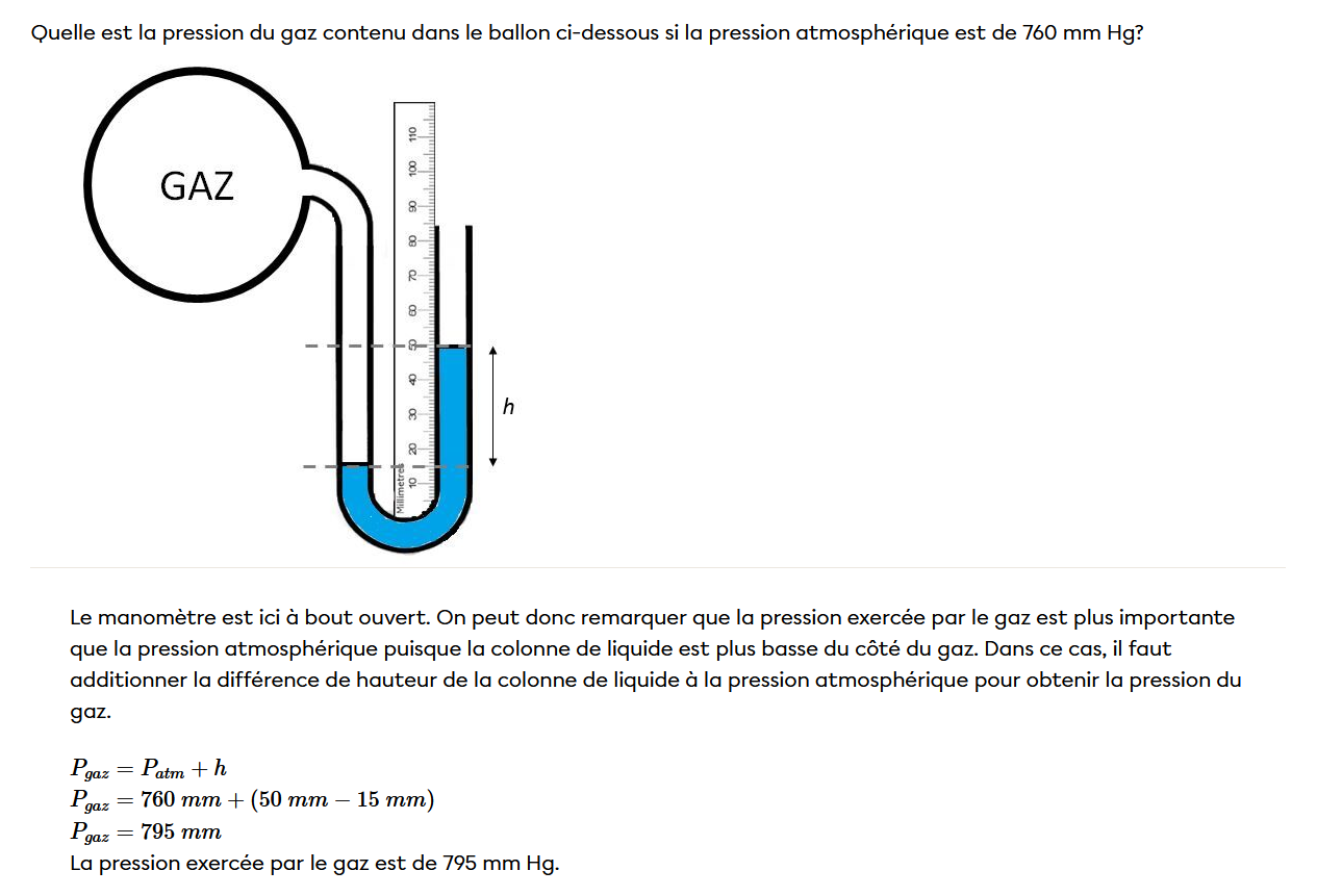 • Lorsque la pression du gaz est supérieure à la pression atmosphérique, le niveau du liquide est plus bas du côté du gaz. Il faut alors noter la différence en hauteur et l'additionner à la pression atmosphérique.