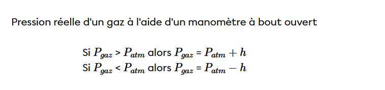• Lorsque la pression atmosphérique est supérieure à la pression du gaz, le niveau du liquide est plus haut du côté du gaz. Il faut alors noter la différence en hauteur et la soustraire à la pression atmosphérique.