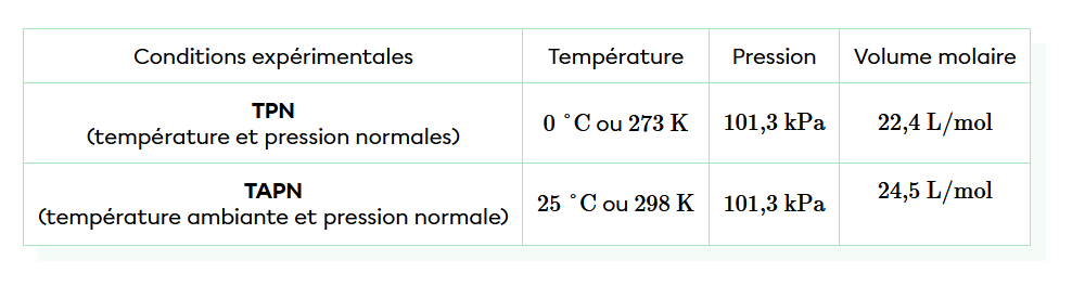 Le volume molaire est le volume occupé par une mole de gaz, quelque soit le type de gaz, à une température et une pression précises. Il s'exprime en L/mol.