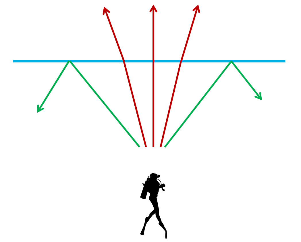 Si un plongeur est sous l'eau et qu'il regarde vers le haut, il voit un «trou» circulaire à la surface de l'eau, directement au-dessus de lui. Tout le reste de la surface ressemble à un miroir. Expliquez ce phénomène.