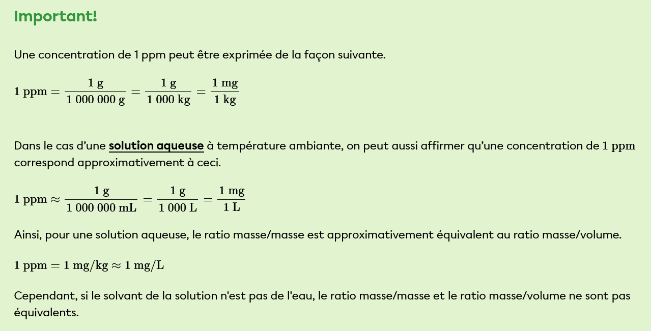Si tu veux en savoir plus sur les ppm, leurs formules et voir des exercices corrigés, je t'invite à suivre ce lien : https://www.alloprof.qc.ca/fr/eleves/bv/sciences/les-ppm-parties-par-million-s1576.