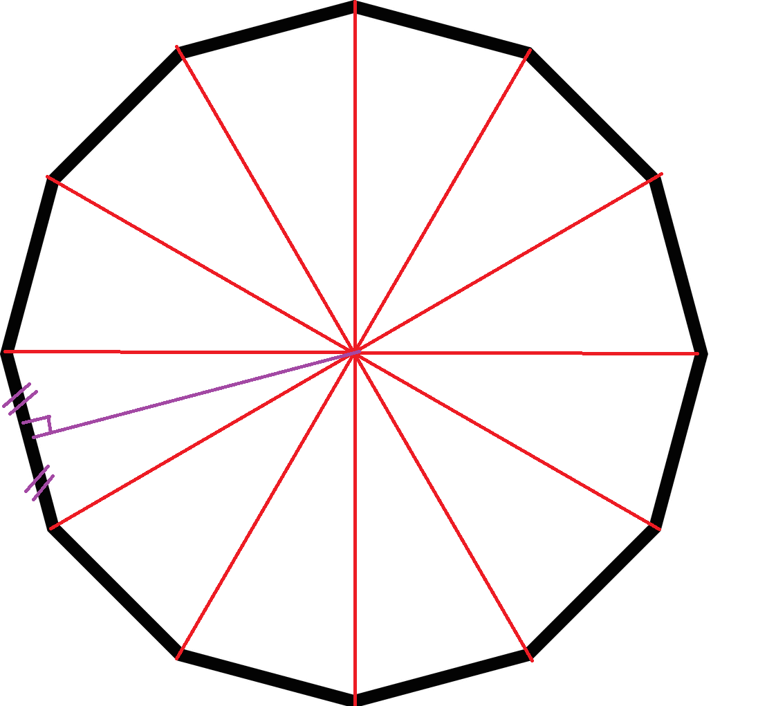 Pour trouver l'apothème, il te suffit de trouver le milieu d'un côté et de le relier au centre du polygone, comme illustré en mauve ici: