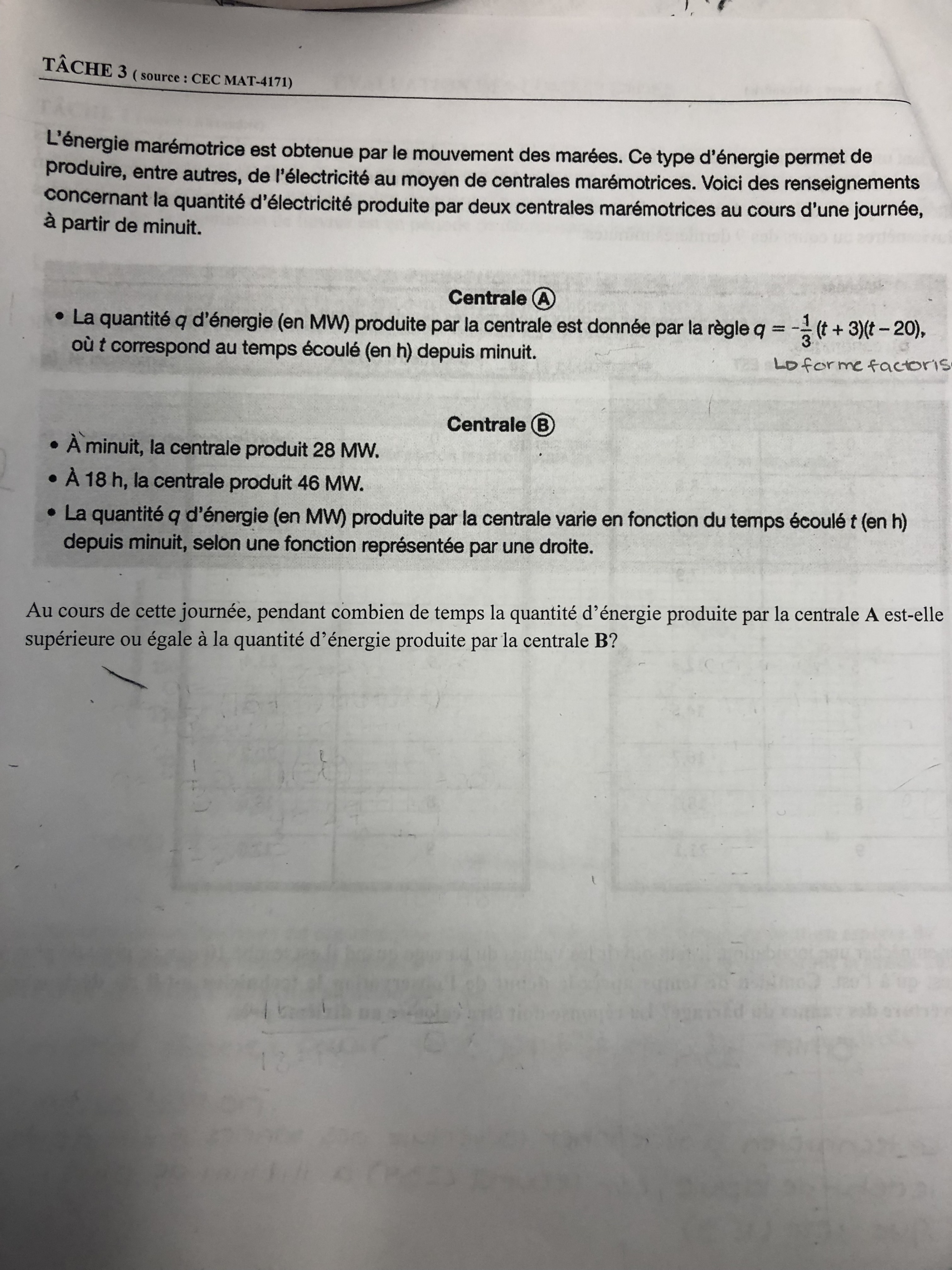 Pour mettre en lumière le tout, tu devras trouver la règle, sous forme de fonction affine, de la centrale B pour après faire fonction B - fonction A ≤ 0 si f(B)≤f(A) et trouver pour quels \( t \) la fonction A est supérieure ou égale à la quantité d'énergie \( q \) produite par B.