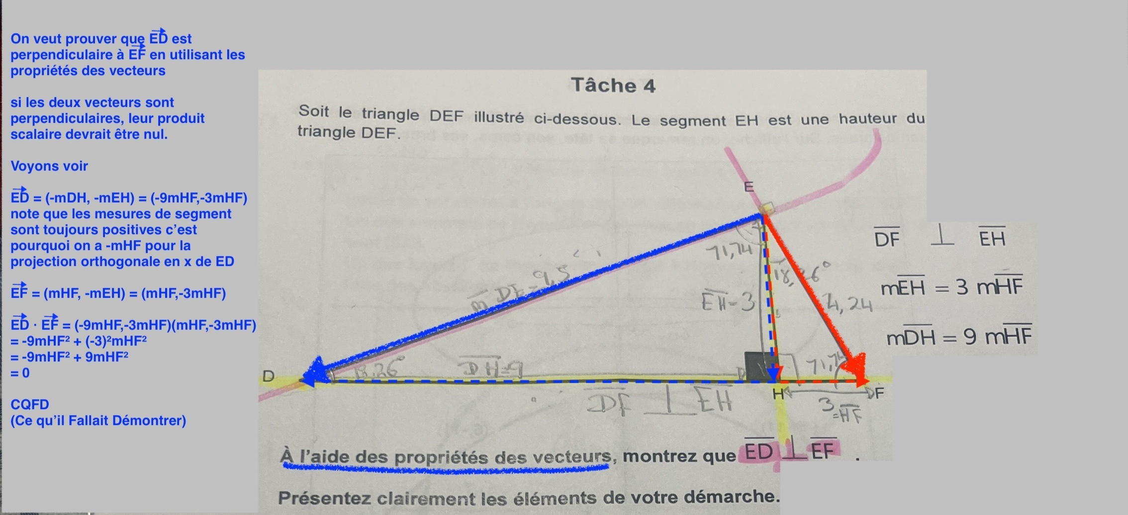 Pour résoudre ce problème, tu dois savoir que deux vecteurs sont parallèles si leur produit scalaire est nul. Donc, nous devons prouvé que \( \vec{ED} \cdot \vec{EF} = 0\)