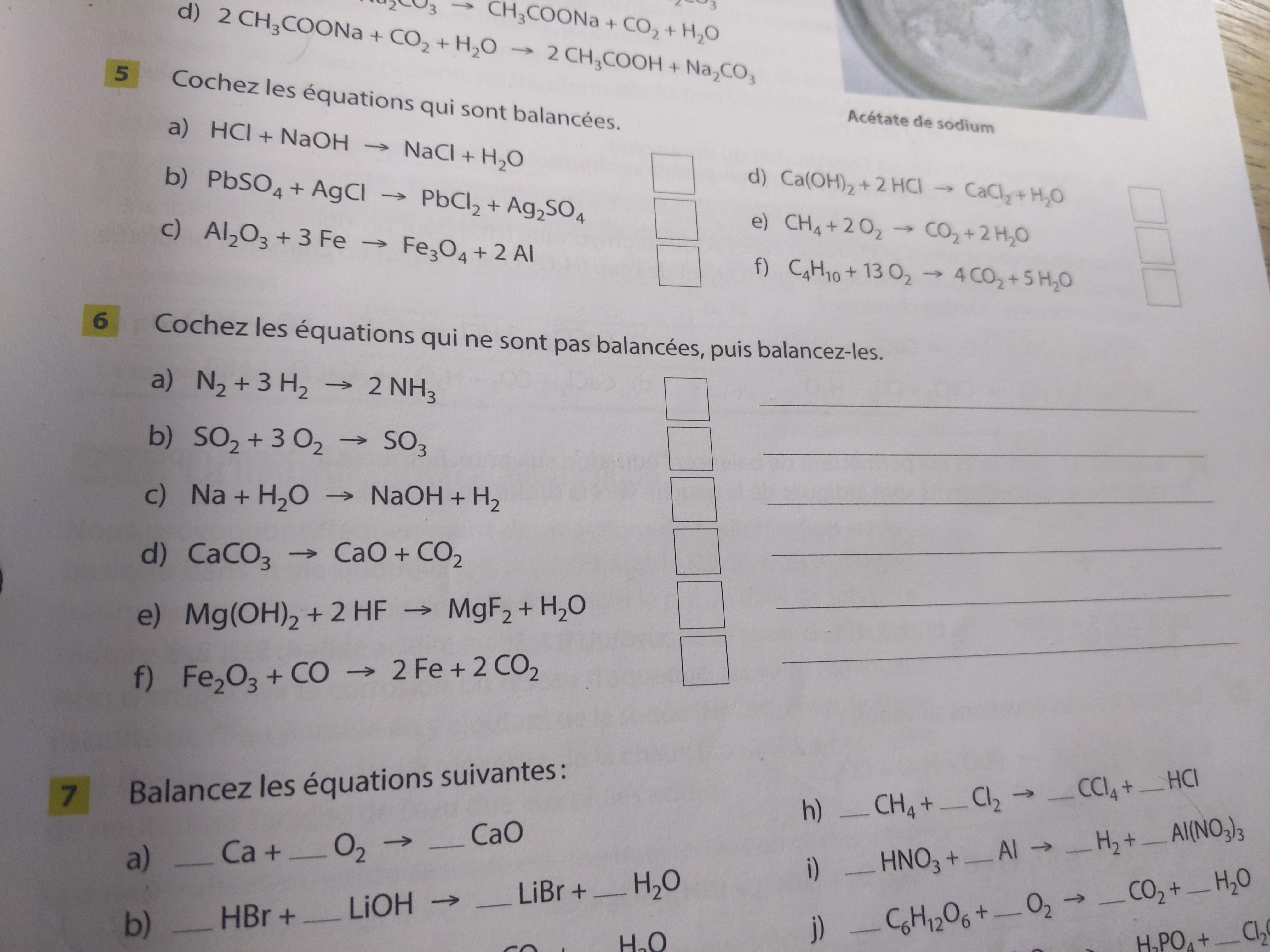Merci beaucoup pour ta question! Une équation est balancée lorsque le nombre d’atomes des deux côtés est le même. Par exemple, pour le numéro 6 a), tu dois regarder si le nombre d’atomes d’azote est le même du côté des réactifs et du côté des produits. Ensuite, tu fais la même chose avec l’hydrogène. Voici une fiche qui pourrait grandement t’aider :
