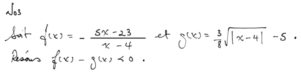 Par la suite si tu multiplies l'inéquation de part et d'autre par (x - 4) pour te débarrasser du dénominateur, tu dois déjà à ce moment là considérer les deux possibilités, soit que x > 4 ou x < 4 (car dans ce dernier cas l'inégalité change de sens).