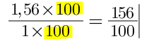 Ensuite, tu vas multiplier le numérateur par une puissance de 10 (10, 100, 1 000...) pour éliminer la virgule : (on a déplacé la virgule à droite autant de fois que le nombre de zéros : il y a 2 zéros donc on déplace la virgule à droite de 2 positions.)