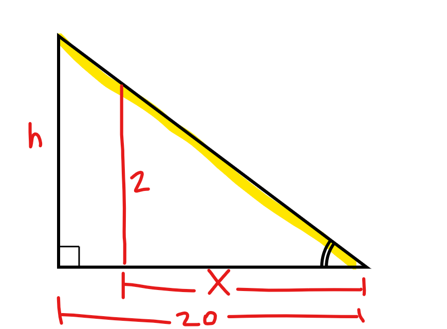 où h est la hauteur de l'ombre, et x la distance de la femme de 2 mètres avec le projecteur. Puisque les triangles sont semblables, on peut poser cette équation :