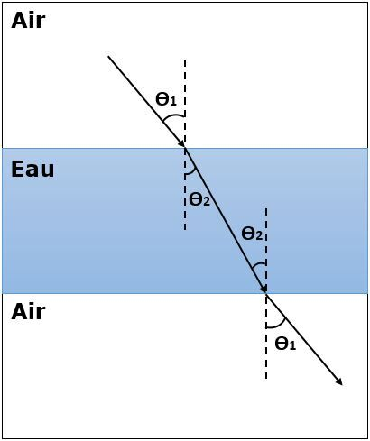 Bonjour, est ce que il est possible d'avoir une RTI si le rayon incident est perpendiculaire à la surface? Je sais qu'il ne sera pas dévié. Aussi, dans le cas d'une lentille semi-circulaire, le rayon incident pourrait provenir de n'importe où autour de la surface circulaire, tant qu'il passe par le centre, nous savons qu'il à un angle incident et réfléchi de 0 degré ( ou encore 90 degré avec la surface ). Est-ce correct? Cependant, je ne comprend alors pas comment la loi de Snell-Descartes peut fonctionner afin de trouver l'angle au niveau du centre, puisque le rayon peut venir de n'importe où. Si tout les côtés d'un cercle peuvent créer un angle de 90 degré entre un rayon et la surface, peut importe sa position, je ne comprends pas comment la loi fait du sens puisque visuellement, l'angle au niveau du centre semble être différent dépendant des situations, mais les données dans la formule sont les même, nous arrivons donc au même angle. Bref, j'espère que c'est clair, car je ne comprends pas quelque chose. Merci et bonne journée!