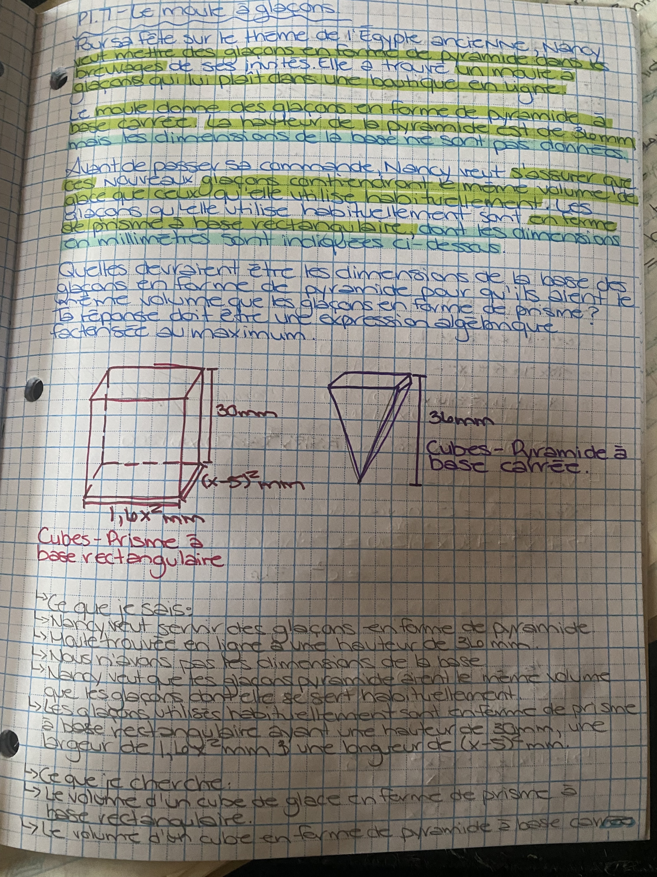 Lorsque tu as le volume du prisme, il te suffit de le multiplier par 3 et le diviser par 36. Tu auras donc la valeur de l'aire de la base de la pyramide. Ensuite, pour trouver les dimensions, utilise la méthode de factorisation d'un trinôme carré parfait.